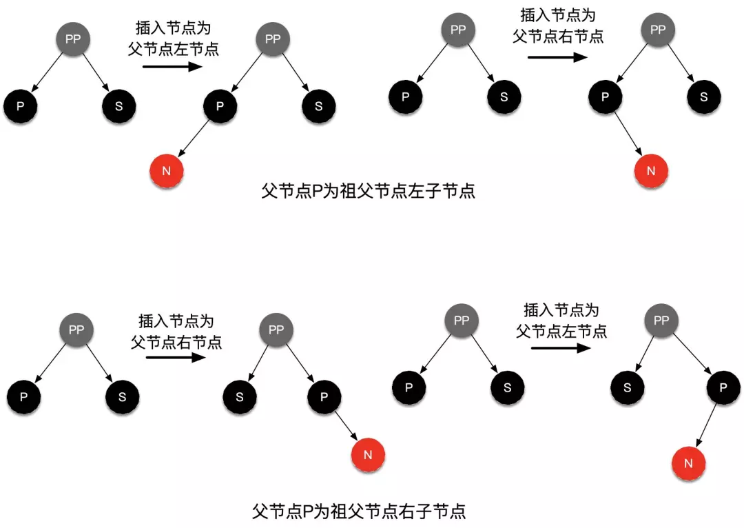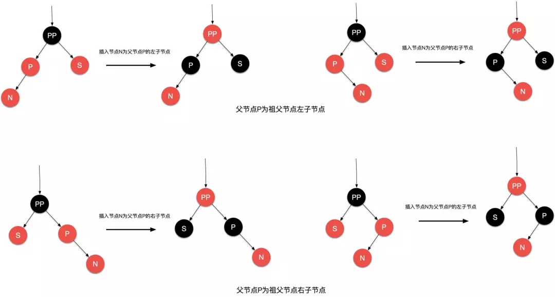 插入节点的叔叔节点是红色节点,根据红黑树性质 4 ,两个红色节点不能直接相连;处理:把父节点 P 及叔叔节点 S 由红色节点变成黑色节点,再把祖父节点 PP 变成红色,至此解决了插入节点与父节点两个红色节点直连的问题,并且黑色节点数量保持不变,但祖父节点由黑色变成了红色;如果祖父节点的父节点是红色节点应如何处理?处理:将祖父节点 PP 当作新插入的红色节点,从祖父节点的父节点开始由底向上进行处理,直至插入节点的父节点为黑色节点或者插入节点为根节点