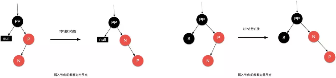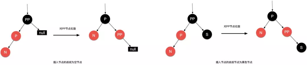 叔叔节点是空节点这种场景好理解,下图中叔叔节点为黑色是什么情况,它不是已经处于非平衡状态了么?莫急,下图只是红黑树的局部图,回顾一下场景四由底向上处理时,祖父节点 PP 由黑色变成红色,对应到下图就是红色的父节点 P。处理:父节点 P 变成红黑色,祖父节点变成红色,并以祖父节点 PP 为支点进行右旋