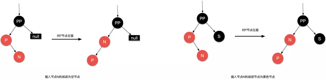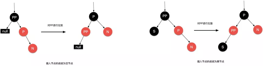 处理:与场景 5.1 互为镜像,父节点 P 变成黑色,祖父节点变成红色,并以祖父节点 PP 为支点进行左旋