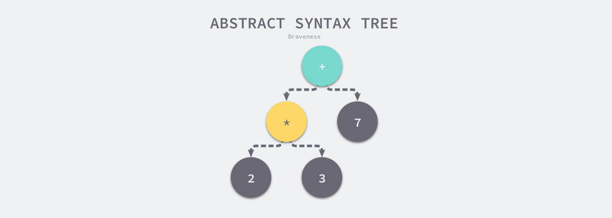 抽象语法树中的每一个节点都表示源代码中的一个元素,每一棵子树都表示一个语法元素,以表达式 2 * 3 + 7 为例,编译器的语法分析阶段会生成如下图所示的抽象语法树