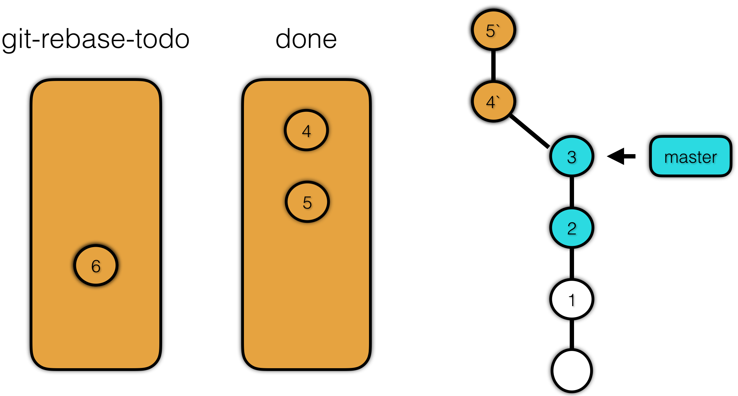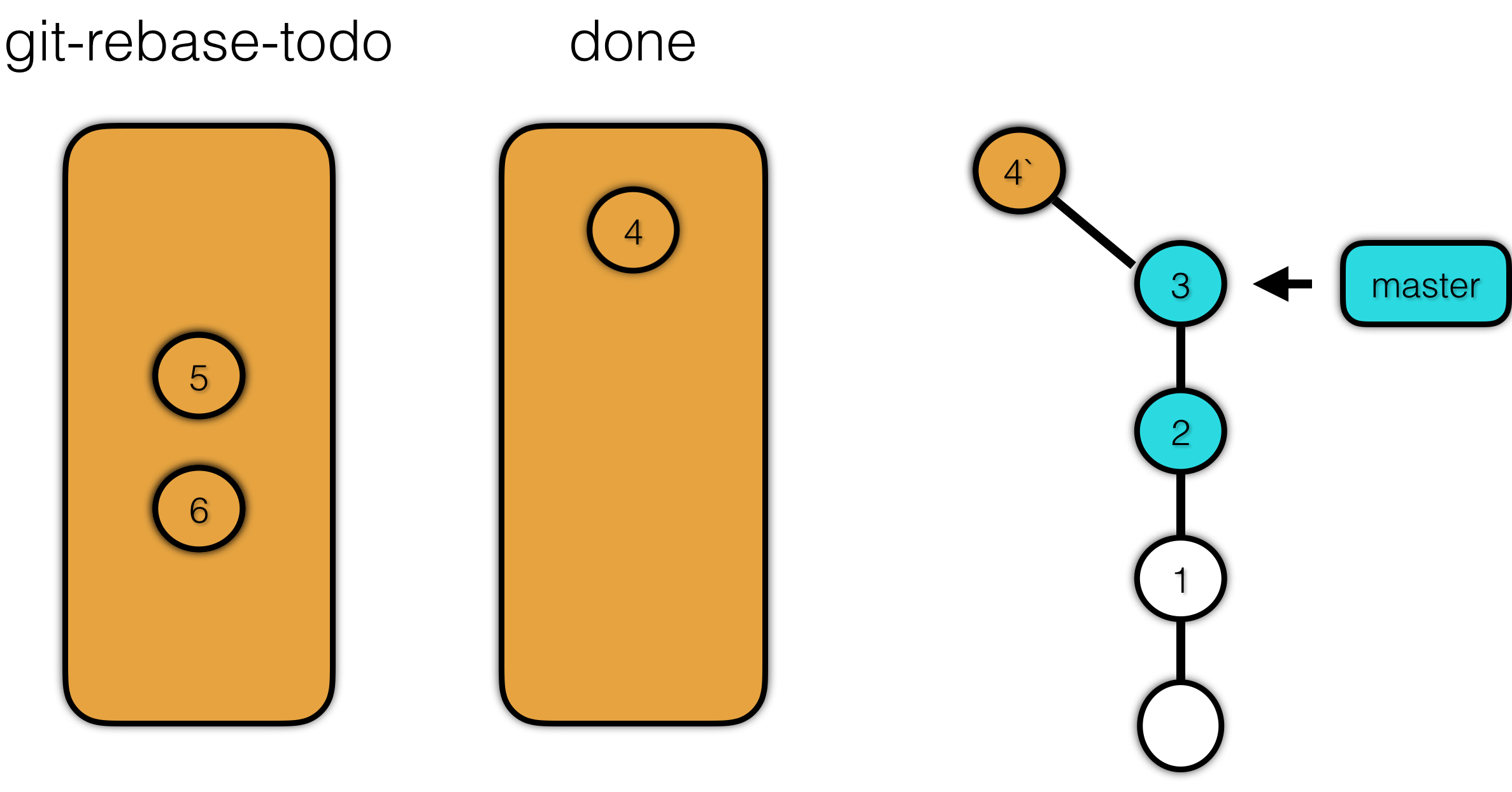 首先 git 将 sha-1 为 4 的 commit 放入 done。表示正在操作 4,然后将 4 以补丁的形式打到 3 上,形成了新的提交 4’。这一步是可能产生冲突的,如果有冲突,需要解决完冲突之后才能继续操作