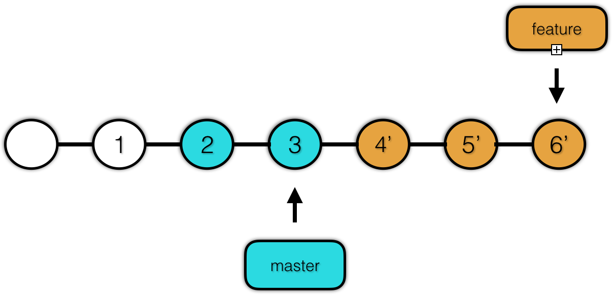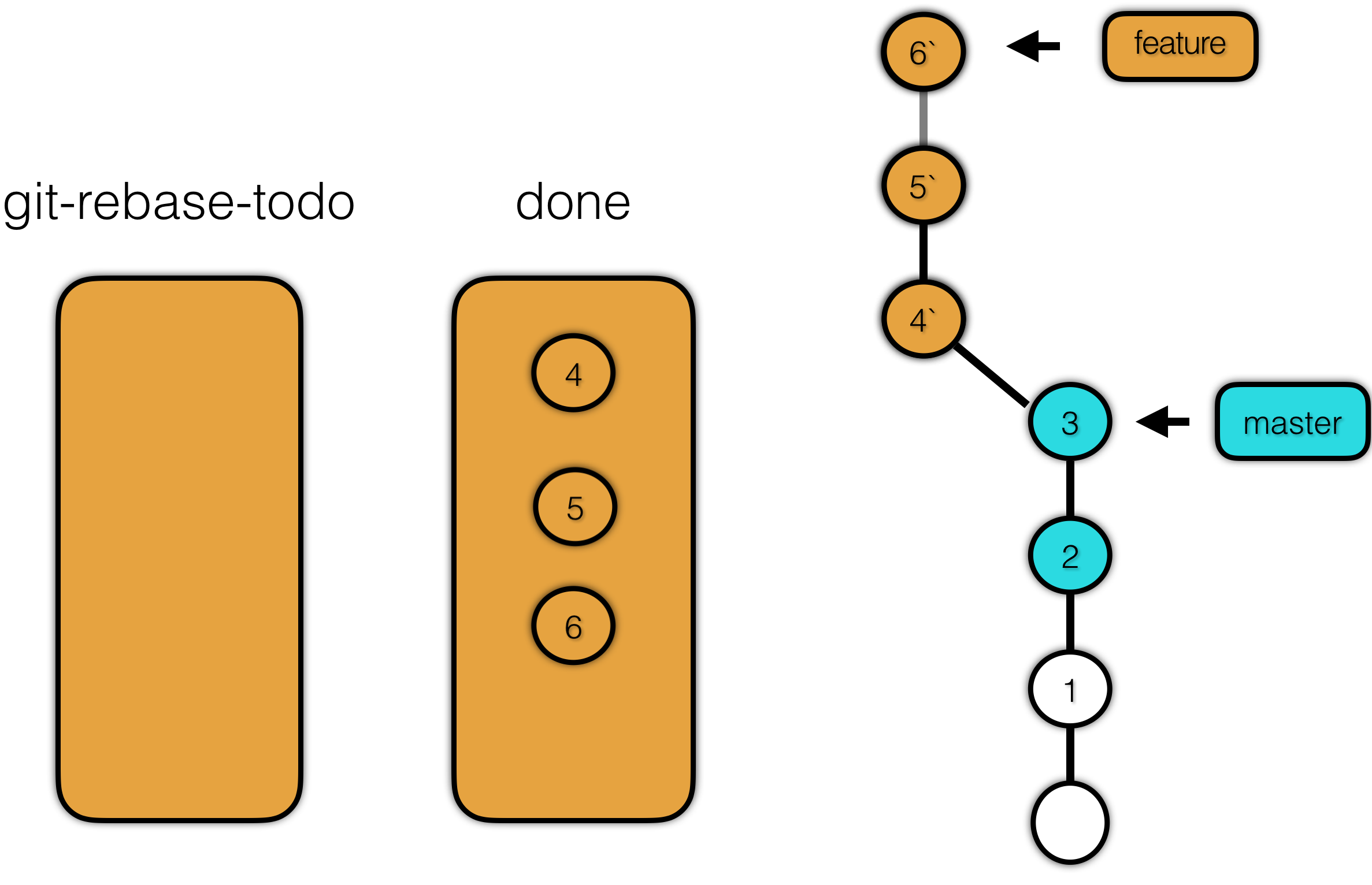 再接着将 sha-1 为 6 的提交放入 done 文件,然后将 6 以补丁的形式打到 5’ 上,形成 6’。最后移动分支指针,使其指向最新的提交 6’ 上。这就完成了 rebase 的操作