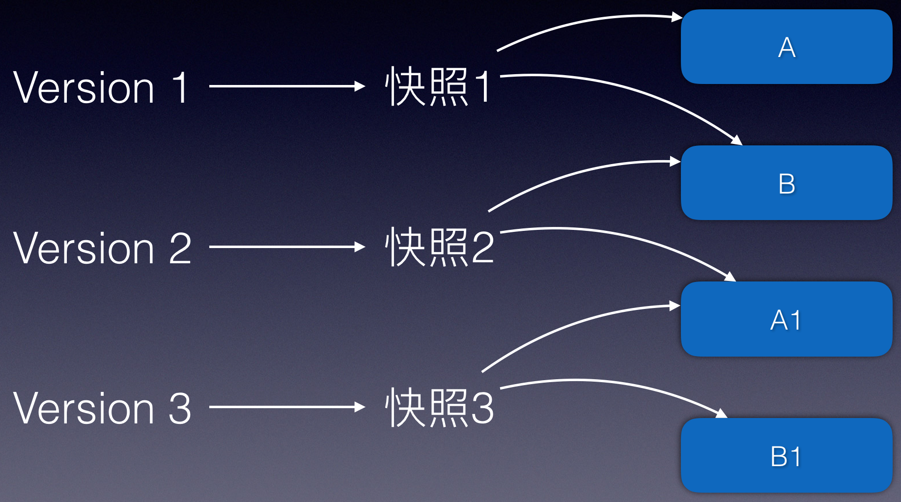 Version1中有两个文件A和B,然后修改了A,变成了A1,形成了Version2,接着又修改了B变为B1,形成了Version3