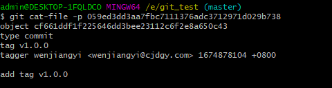 cf661ddf1f225646dd3bee23112c6f2e8a650c43可以看到分支存储了一个 object,我们可以使用 git cat-file -p cf661ddf1f225646dd3bee23112c6f2e8a650c43 命令继续查看该 object 的内容