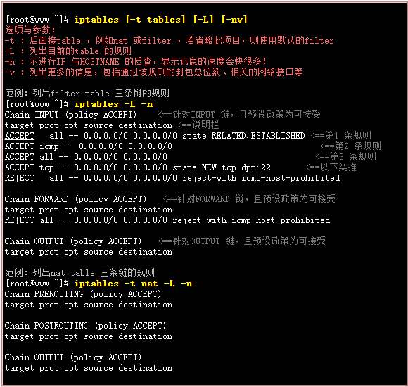 INPUT:主要与想要进入我们Linux 本机的封包有关;OUTPUT:主要与我们Linux 本机所要送出的封包有关;FORWARD:与Linux 本机比较没有关系, 他可以转递封包到后端的计算机中,与下列nat相关性较高