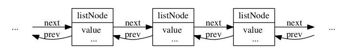 }listNode多个 listNode 可以通过 prev 和 next 指针组成双端链表, 如下图所示: