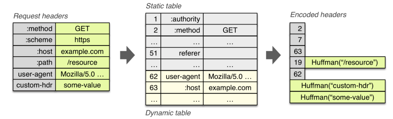 所谓动态表,就是将未包含在静态表中的Header项,在其首次出现时加入动态表,这样后续传输时仅用1个数字表示,大大提升了编码效率。