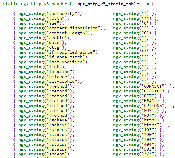 在QPACK中,则上升为98个静态表项,比如Nginx上的ngx_htt_v3_static_table数组所示: