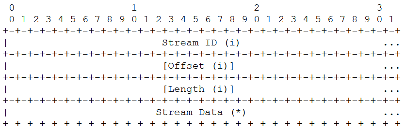 为什么会有8种Stream Frame呢?这是因为0x08-0x0f 这8种类型其实是由3个二进制位组成,它们实现了以下3 标志位的组合: