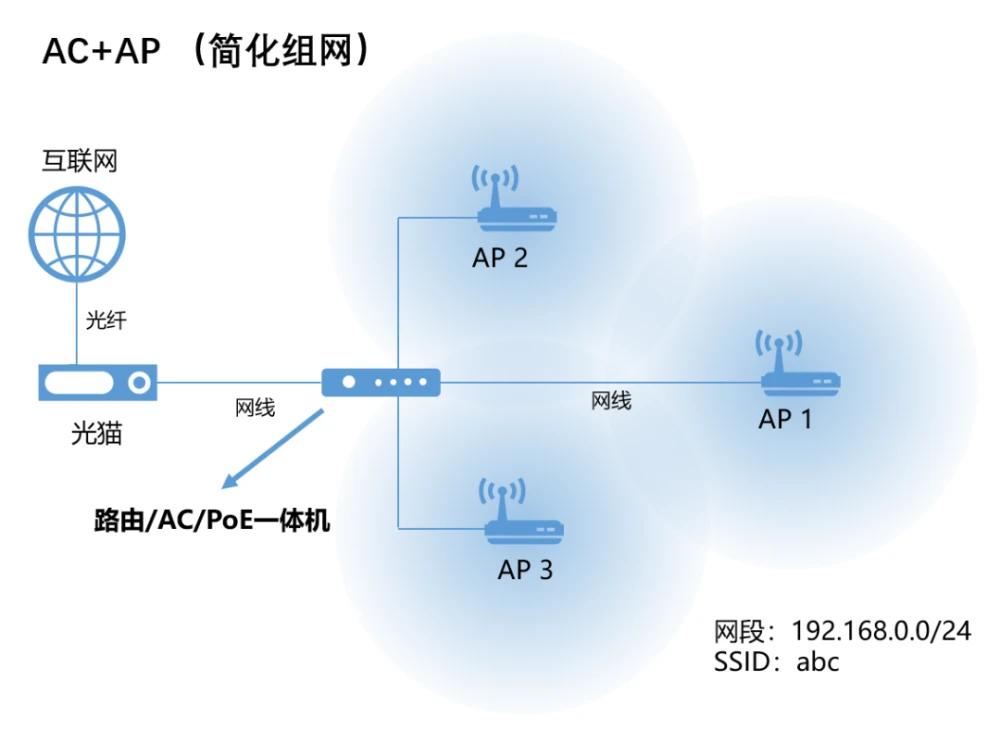 这种组网下的AP功能完善,每个节点都要分别配置,相互独立工作,因此叫做“胖AP(Fat AP)”。