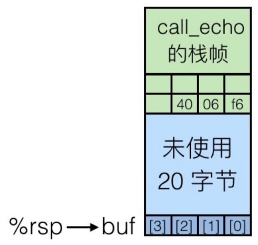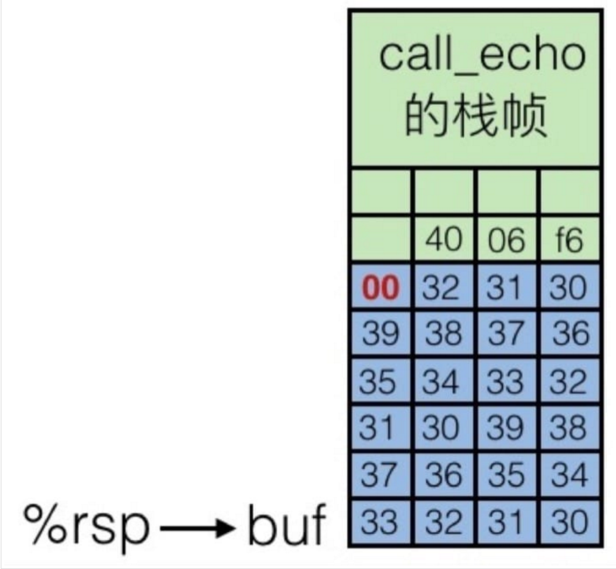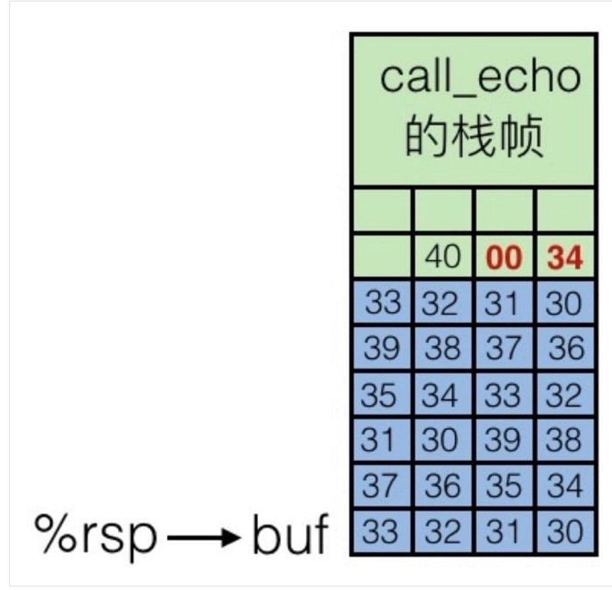 就把返回地址给覆盖掉了,当 echo 执行完成要回到 call_echo 函数时,就跳转到 0x400034 这个内容未知的地址中了。