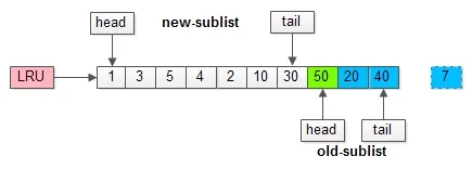 如上图,假如管理缓冲池的LRU长度为10,缓冲了页号为1,3,5…,40,7的页。