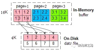 如上图所示,MySQL里page=1的页,物理上对应磁盘上的1+2+3+4四个格。