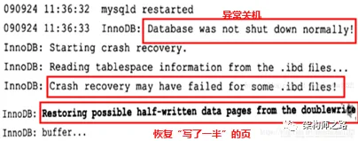 自己实验了几十次,仍没能复现“页数据损坏”,在网上找了一个“页数据损坏”时,MySQL重启过程利用DWB修复页数据的图。
