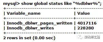 更具体的,InnoDB里有两个变量可以查看double write buffer相关的情况:Innodb_dblwr_pages_written