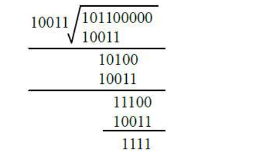 (3) 生成CRC校验码,模2除法运算(即不进位也不借位),也就是异或运算(相同为0 不同为1),得到余数 1111,如果余数不足r,则余数左边用0补齐