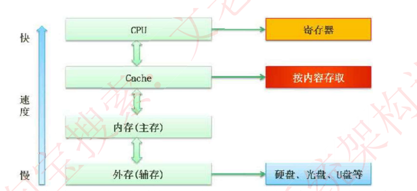外部存储器(硬盘、光盘等,容量大,速度慢,长期保存数据);输入设备和输出设备合并称为外设